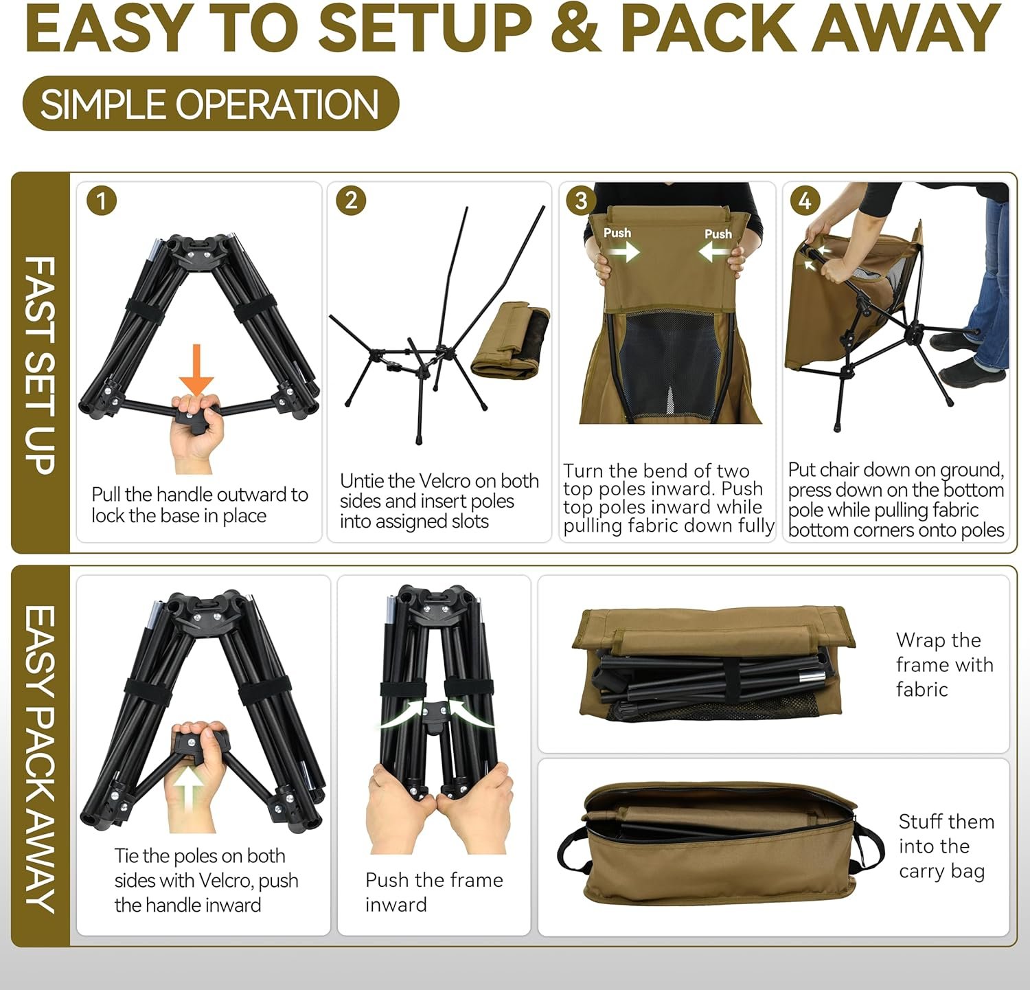 Elevate your outdoor seating experience with the MARCHWAY Lightweight Folding High Back Camping Chair, the ultimate solution for comfort and portability on your next adventure. Designed for campers, hikers, and travelers who demand support without the bulk, this Highback Khaki chair features an ergonomic design with an extended backrest and an integrated sponge-padded pillow. This structure provides full support for your back, neck, and head, allowing you to lean back completely and relax after a long day of trekking or during a lazy afternoon at the beach.